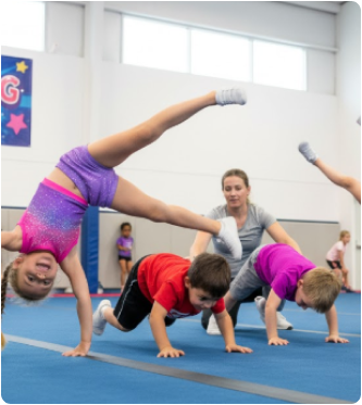 • Toddler Tumble (2–4 years): Independent exploration of basic tumbling and motor skills.